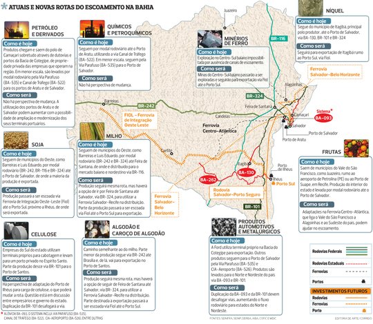 Já os empresários do agronegócio, do Oeste do estado, dependem sobretudo da rodovia BR-242, que faz a ligação com a BR-324 (Feira de Santana) e, depois, com o litoral. “Perde-se muito pela infraestrutura precária. A BR-242 tem boas condições, mas está sobrecarregada.