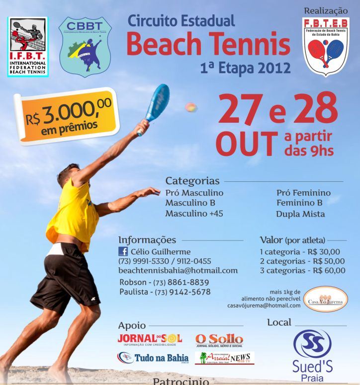 Atletas e apaixonados pelas areias já podem ir se preparando. A Federação de Beach Tennis do Estado da Bahia promove, nos dias 27 e 28 de outubro, a primeira etapa do Circuito Estadual Beach Tennis, válida pelo ranking baiano. Serão três mil reais em prêmios, disputados nas categorias pró-masculino, pró-feminino, masculino B, feminino B, masculino +45 e dupla mista.
