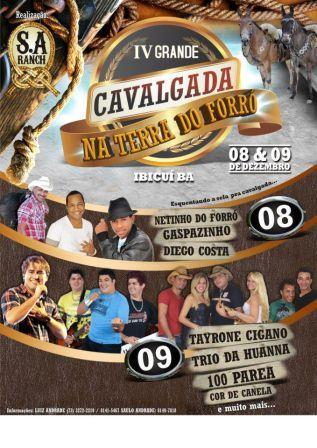 Neste final de semana, sábado (08) e domingo (09) estará acontecendo, em Ibicuí, a IV Cavalgada na Terra do Forró. Serão dois dias de muita festa, reunindo gente bonita de toda a região, como sempre tem acontecido nas edições anteriores. Além disso, vários show já estão confirmados para o evento. No sábado, à noite, passarão pelo palco Netinho do Forró, Gasparzinho e Diego Costa. Já no domingo (09), à tarde e à noite, será a vez de Tayrone Cigano, 100 Parea, Trio da Huanna e Cor de Canela.