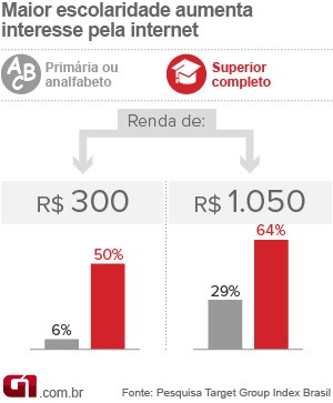 Entre as famílias com renda mensal de R$ 300 a R$ 600, por exemplo, a adesão à internet é de 10% entre as quais o chefe do domicílio é analfabeto ou tem apenas instrução primária. Já nas casas com essa mesma renda, mas com um membro da família com ensino superior, a penetração da internet chega a 50%.