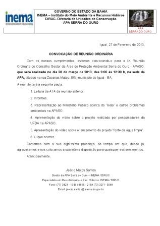 Os conselheiros da Área de Proteção Ambiental Serra do Ouro (APASO), de Iguaí, estarão se reunindo para o início dos trabalhos do ano de 2013.