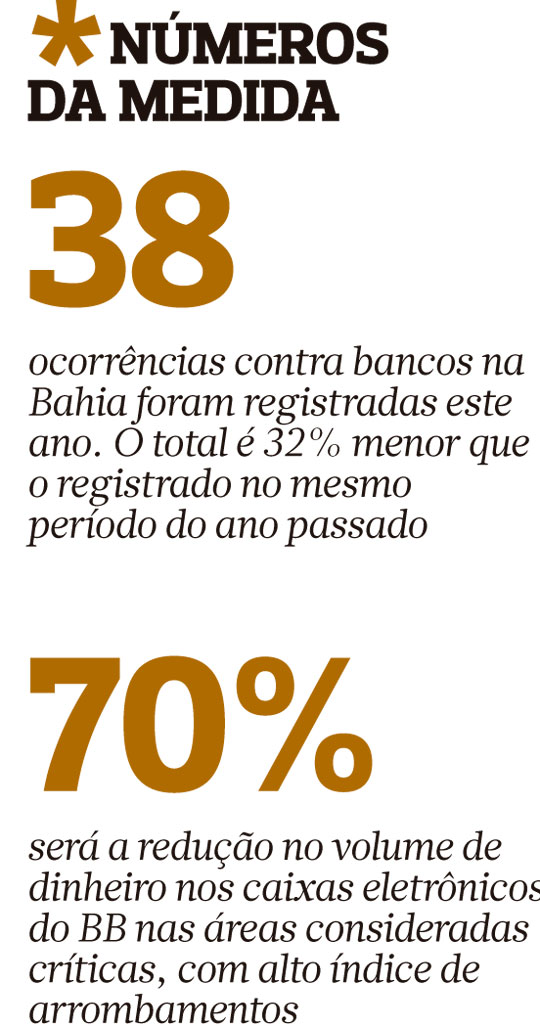 Este ano, o Sindicato dos Bancários da Bahia já registrou 38 ocorrências de assaltos a banco ou caixas eletrônicos, ante 56 registrados no mesmo período do ano passado. O delegado Daniel Pinheiro, do Grupo Avançado de Repressão a Crimes contra Instituições Financeiras (Gacif) acredita que esse número pode baixar muito mais quando o ataque a caixas eletrônicos deixar de ser rentável aos criminosos. “Enfim, atenderam uma recomendação antiga nossa. Com pouca quantia não compensa. Se tiver R$ 50 mil, pra dez pessoas, fica R$ 5 mil para cada um, não compensa”, afirmou.