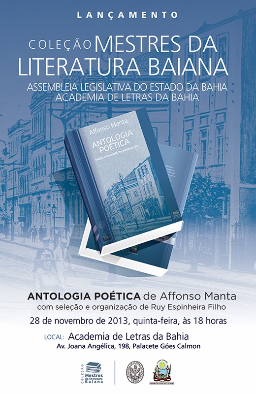O livro foi organizado e selecionado pelo escritor Ruy Espinheira Filho. O volume faz parte da Coleção Mestres da Literatura Baiana. O evento acontecerá às 18 horas, na Academia de Letras da Bahia, Av. Joana Angélica, 198 – Palacete Góes Calmon, no bairro de Nazaré. Na ocasião, o Portal Poções será representado pelo comunicador Elvio Magalhães. Affonso Manta Alves Dias (foto) foi um dos poetas brasileiros mais originais de seu tempo, conquanto em parte desconhecido. Nascido em Salvador, a 23 de agosto de 1939, foi guia em museu de arte sacra, repórter do Diário de Notícias e, posteriormente, inspetor da Seção de Reclamações dos Correios e Telégrafos, onde se aposentou. Era, pela via paterna, primo de quarto grau do grande poeta Castro Alves, embora nunca tenha feito proselitismo em cima disso.