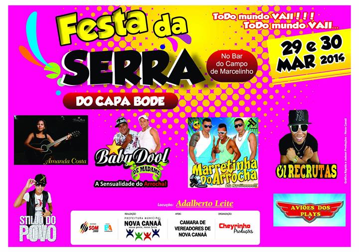Será realizada, nos dias 29 e 30 de março, na Serra do Capa Bode, no município de Nova Canaã, uma festa para os moradores daquela localidade, juntamente com moradores de Nova Canaã e cidades circunvizinhas.