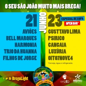 Já no dia dia 23/06 (segunda-feira), no segundo dia da festa, agitarão o Brega Light, Gusttavo Lima, Psirico, Cangaia, Luxúria e Oito7Nove4. Ainda haverá uma novidade neste dia, pois o evento será open bar, com tudo liberado para os foliões.