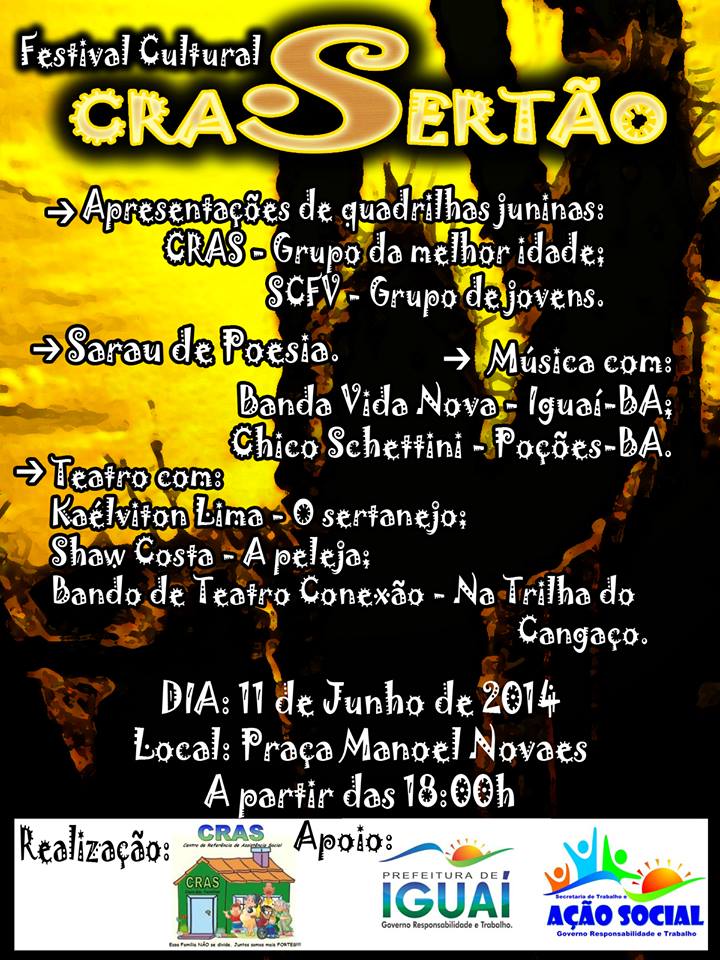 No dia 11 de junho o Cras de Iguaí estará promovendo, na Rua Iraci, em frente a secretaria de ação social, o Festival Cultural CraSertão que contará com uma grande de diversidade de apresentações.