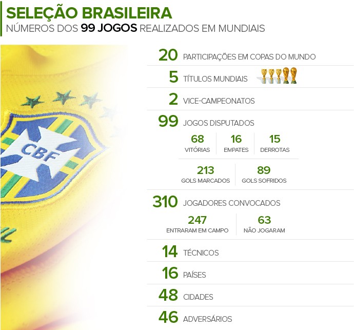 Brasília será a 49ª cidade a receber os jogadores brasileiros na história da competição. Ninguém imagina algo diferente da 69ª vitória e dos gols 214, 215, 216… O currículo verde e amarelo ensina a pensar grande. Pensar que, justamente na Copa em casa, a equipe pode assumir a liderança deste ranking. A Seleção chegou a 2014 com um jogo a menos do que a Alemanha. No fim da primeira fase, estará 101 a 100 para os europeus.