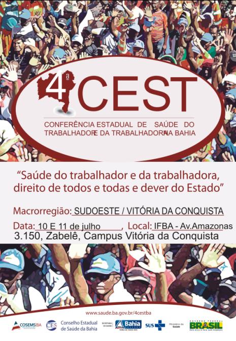 Com o tema “Saúde do trabalhador e da trabalhadora, direito de todos e todas e dever do estado”, nos próximos dias 10 e 11 de julho, será realizada em Vitória da Conquista a 1ª Conferência Macrorregional Sudoeste de Saúde do Trabalhador e da Trabalhadora. O evento acontecerá no auditório do Instituto Federal da Bahia (Ifba), a partir das 9h, e contará com o apoio da Prefeitura por meio do Centro de Referência em Saúde do Trabalhador (Cerest).