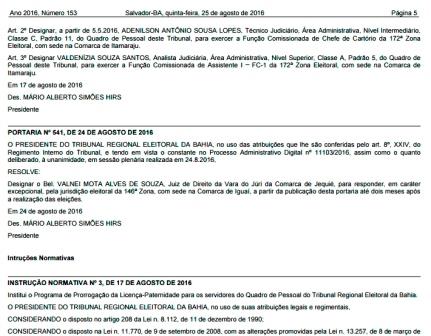 A decisão foi tomada pelo Presidente do Tribunal Regional Eleitoral da Bahia, Des. Mário Alberto Simões Hirs, tendo em vista o constante no Processo Administrativo Digital nº 11103/2016. Sendo assim, foi designado o Bel. Valnei Mota Alves de Souza, Juiz de Direito da Vara do Júri da Comarca de Jequié, para responder, em caráter excepcional, pela jurisdição eleitoral da 146ª Zona, até dois meses após a realização das eleições.