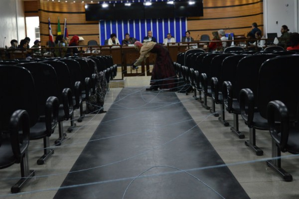 A audiência foi marcada ainda por uma performance do ator conquistense Marcelo Benigno, que, inspirado nas Moiras e Parcas da mitologia grega, enrolou e desenrolou fios de barbante por todo o auditório da Câmara Municipal de Vereadores, cobrando o “desenrolar” da situação.