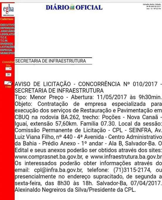 Foi publicado ontem (08) no Diário Oficial do Estado da Bahia o Aviso de Licitação – Concorrência nº 010/2017, da Secretaria de Infraestrutura do Estado para a contratação de empresa especializada para execução dos serviços de restauração e pavimentação em na rodovia BA 262, no trecho ligando Poções – Nova Canaã – Iguaí, em uma extensão 57,60 km.