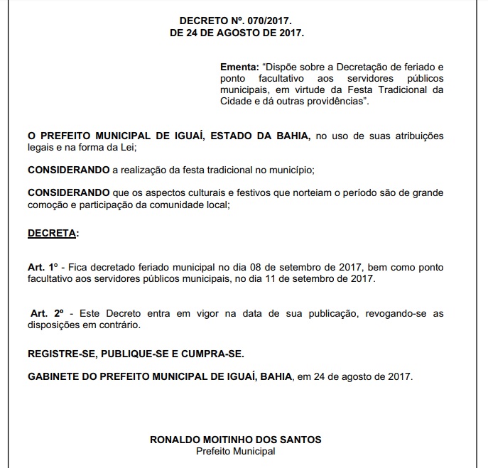 O decreto foi publicado devido a realização da Festa de Setembro que acontecerá nos dias 07, 08, 09 e 10, na Praça Manoel Novaes em Iguaí.