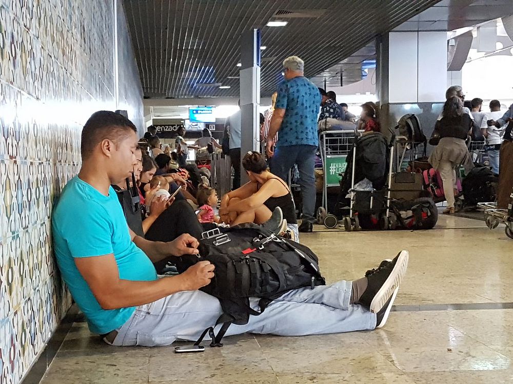 Um grupo de amigos está desde as 6h à espera do voo para a Angola. Até lá, com uma conexão em São Paulo, a viagem é de 8h. Eles deveriam ter embarcado às 8h, mas não aconteceu. Quando chegou no local, o grupo se deparou com os guichês lotados. Os passageiros, conta a professora Gildete Farias, 63 anos, deitaram no chão e reclamavam de forte calor dentro do aeroporto.