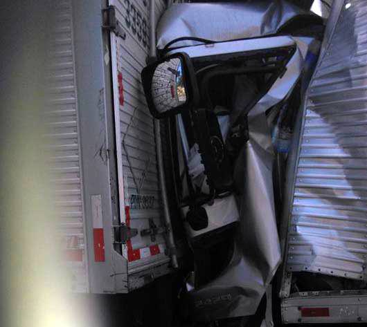 Uma das carretas ficou atravessada, interditando totalmente a rodovia. A boleia ficou de cabeça para baixo, após o impacto. Toda carga de pneus ficou espalhada pela pista. Outra imagem mostra outra boleia completamente esmagada, após colidir na traseira da carreta que seguia a frente.