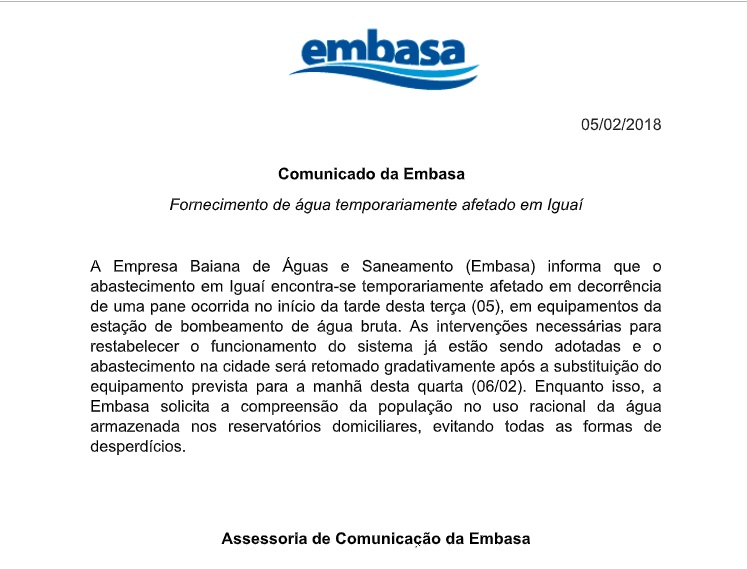 A Empresa Baiana de Águas e Saneamento (Embasa) emitiu comunicado à imprensa, hoje (05), informando sobre a interrupção no fornecimento de água na cidade.