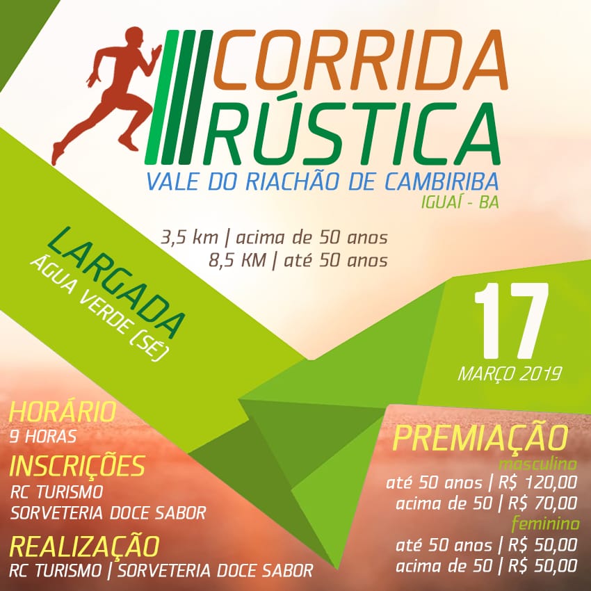 A III Corrida Rústica será realizada na manhã de domingo (17), a partir das 09h00 na região do Riachão de Camberiba, em Iguaí.