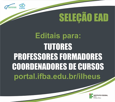 O Instituto Federal de Educação, Ciência e Tecnologia da Bahia – IFBA, Campus Ilhéus, lança editais para processos seletivos simplificados para coordenadores de cursos, professores formadores e tutores bolsistas do Programa Universidade Aberta do Brasil – UAB.