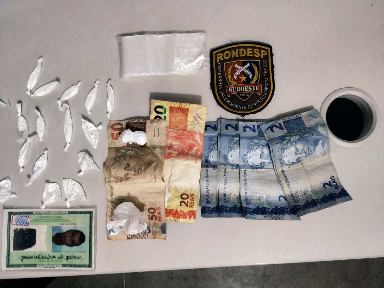 Após abordagem foi encontrado sob posse do mesmo 15 porções pequenas e mais 2 porções maiores de cocaína, 1 porção pequena de maconha, embalagens plásticas e R$ 82,00 em espécie, sendo então conduzido e apresentado na 21ª COORPIN/Itapetinga.