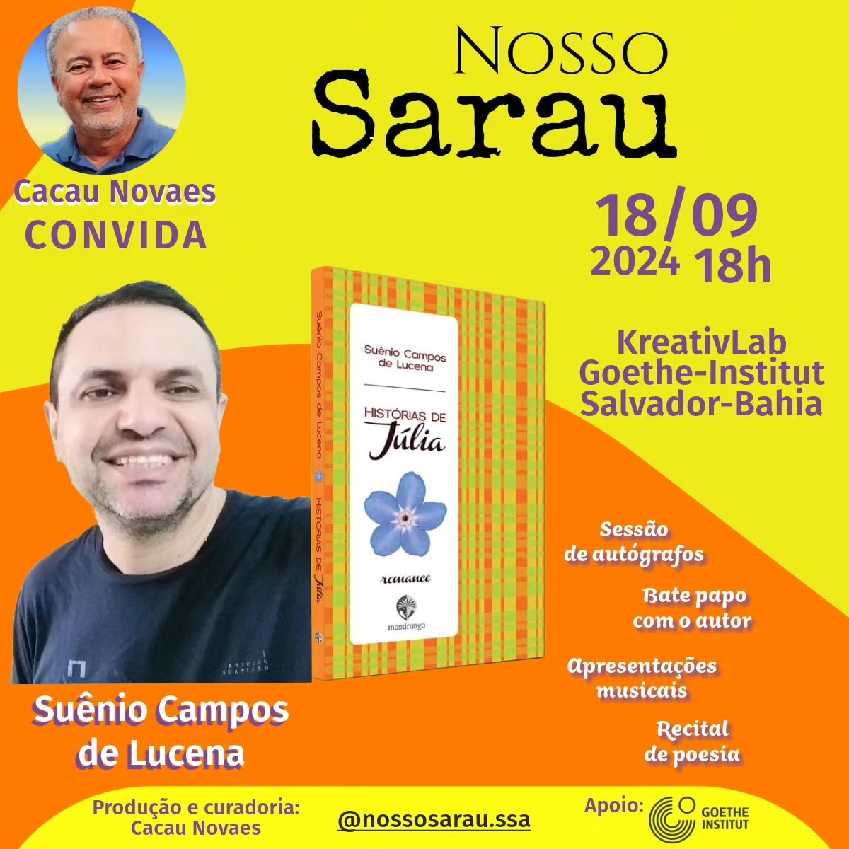 A próxima edição do Nosso Sarau tem como convidado Suênio Campos de Lucena, que participa de um bate papo, mediado por Décio Torres, sobre a sua trajetória literária, além de uma sessão de autógrafos do seu livro Histórias de Júlia.