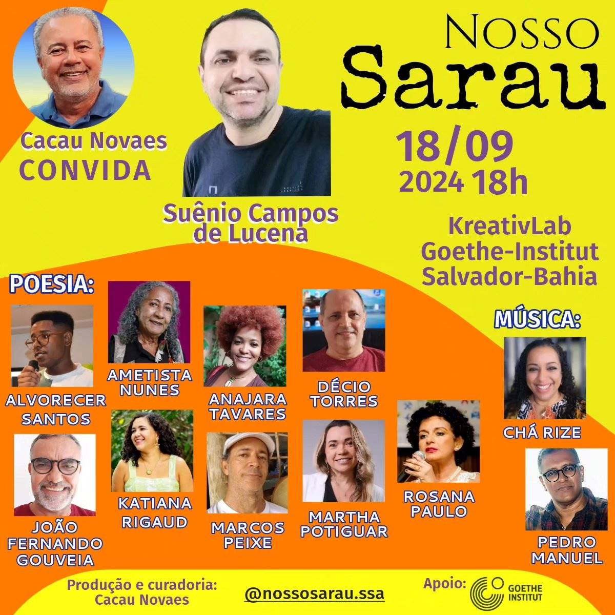 O Nosso Sarau tem a produção e curadoria de Cacau Novaes, com o apoio do Goethe-Institut Salvador Bahia. A entrada é gratuita. O evento também é transmitido pelo perfil do Instagram @nossosarau.ssa, na íntegra.