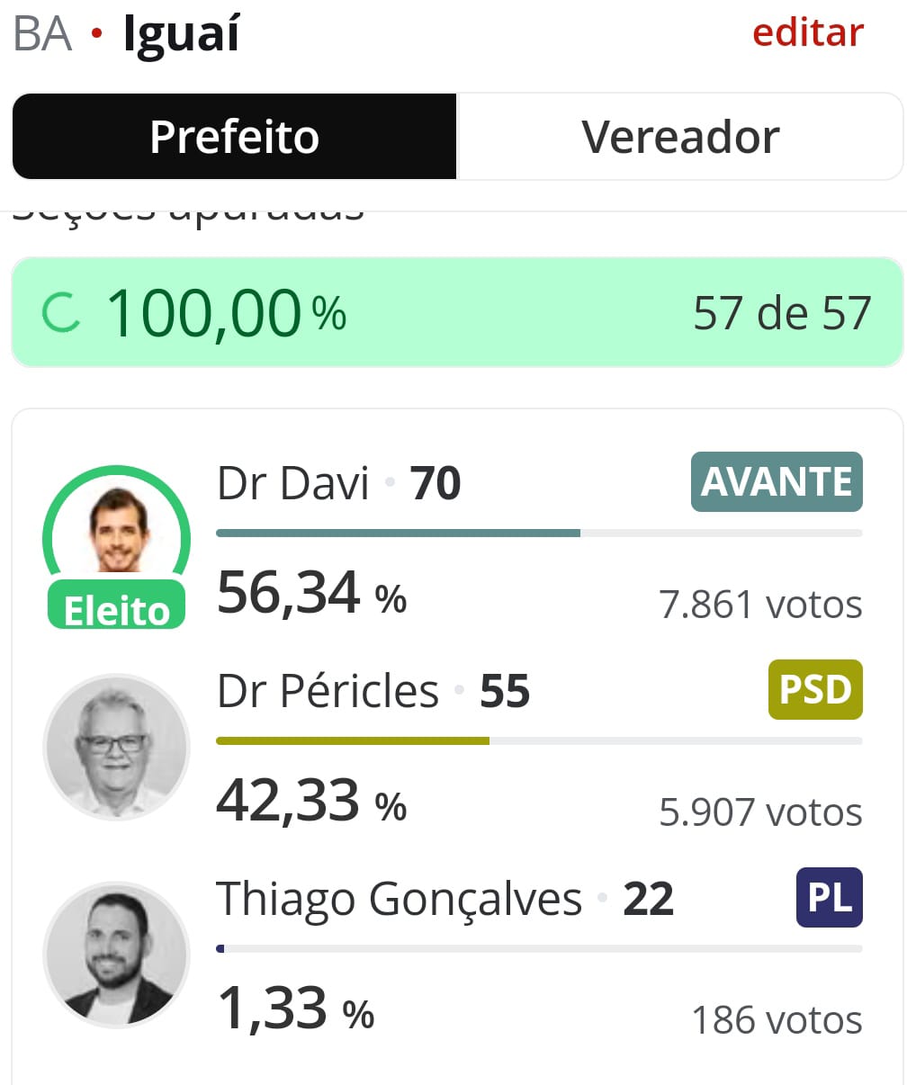 O candidato do Avante, Dr. Davi, venceu as eleições municipais em Iguaí, sendo eleito prefeito com 7.861 votos válidos, alcançando um percentual de 56,34%.