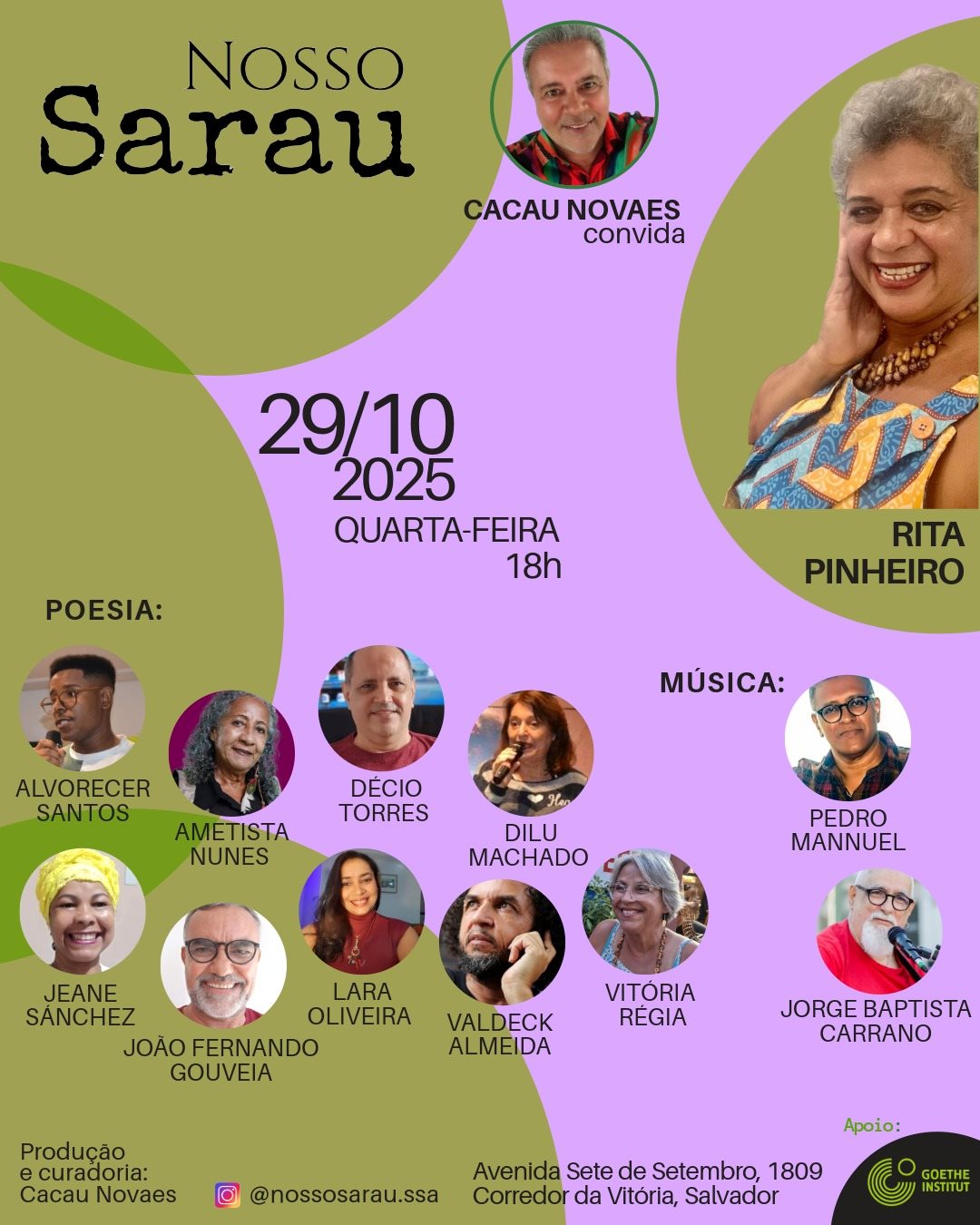 O Nosso Sarau recebe Rita Pinheiro na edição deste mês, no dia 29 (quarta-feira), em uma programação que começa às 18h e vai até às 21h30 no KreativLab do Goethe-Institut Salvador.