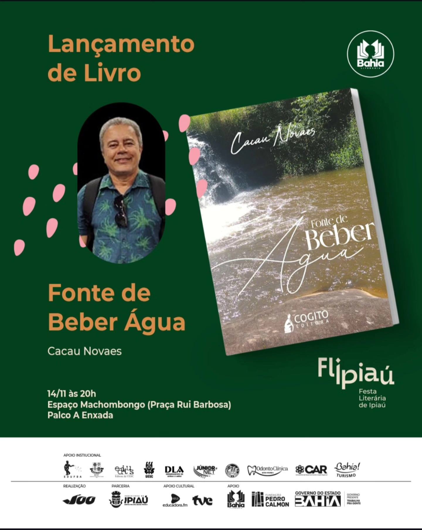 O escritor iguaiense Cacau Novaes lança o livro “Fonte de Beber Água” nesta sexta-feira (14), às 20 horas, na Festa Literária de Ipiaú – Flipiaú. O lançamento acontece na Praça Rui Barbosa, no Centro da cidade, no Palco A Enxada.