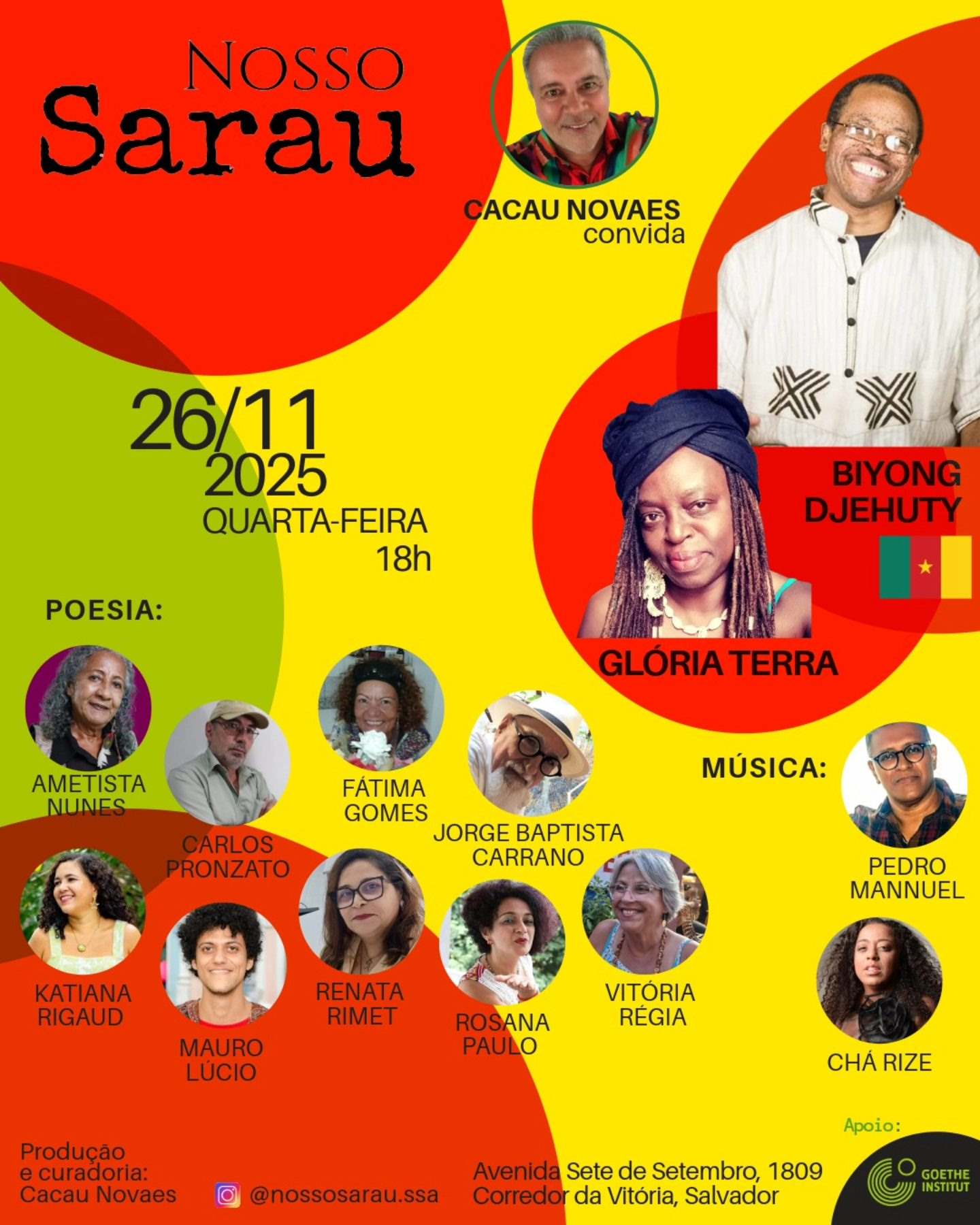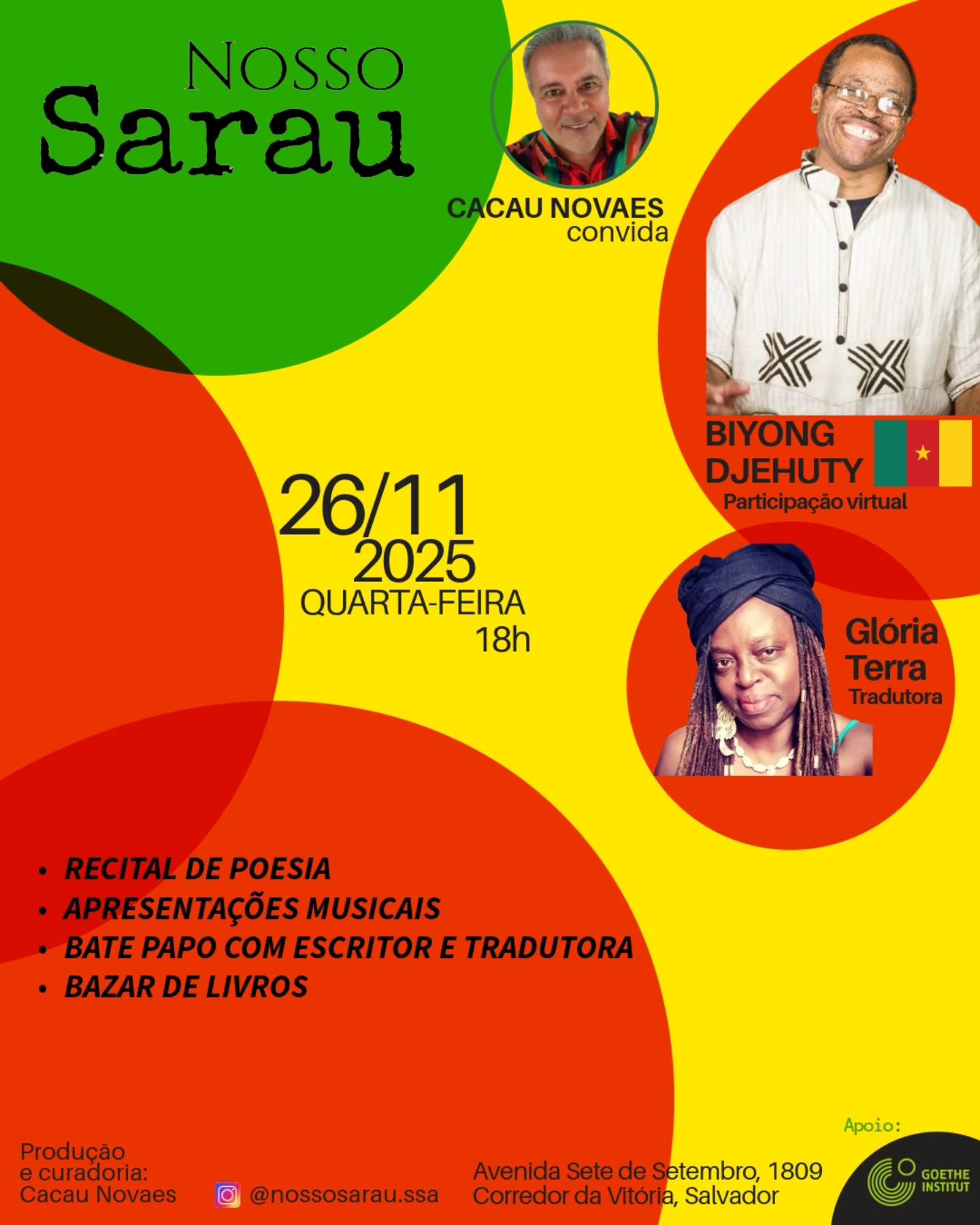O evento acontece nesta quarta-feira (26), às 18h, no KreativLab do Goethe-Institut Salvador, que fica situado no Corredor da Vitória, com entrada gratuita. A participação de Biyong Djetuty será virtual, com a mediação de Glória Terra (Brasil), que estará presencialmente no sarau.