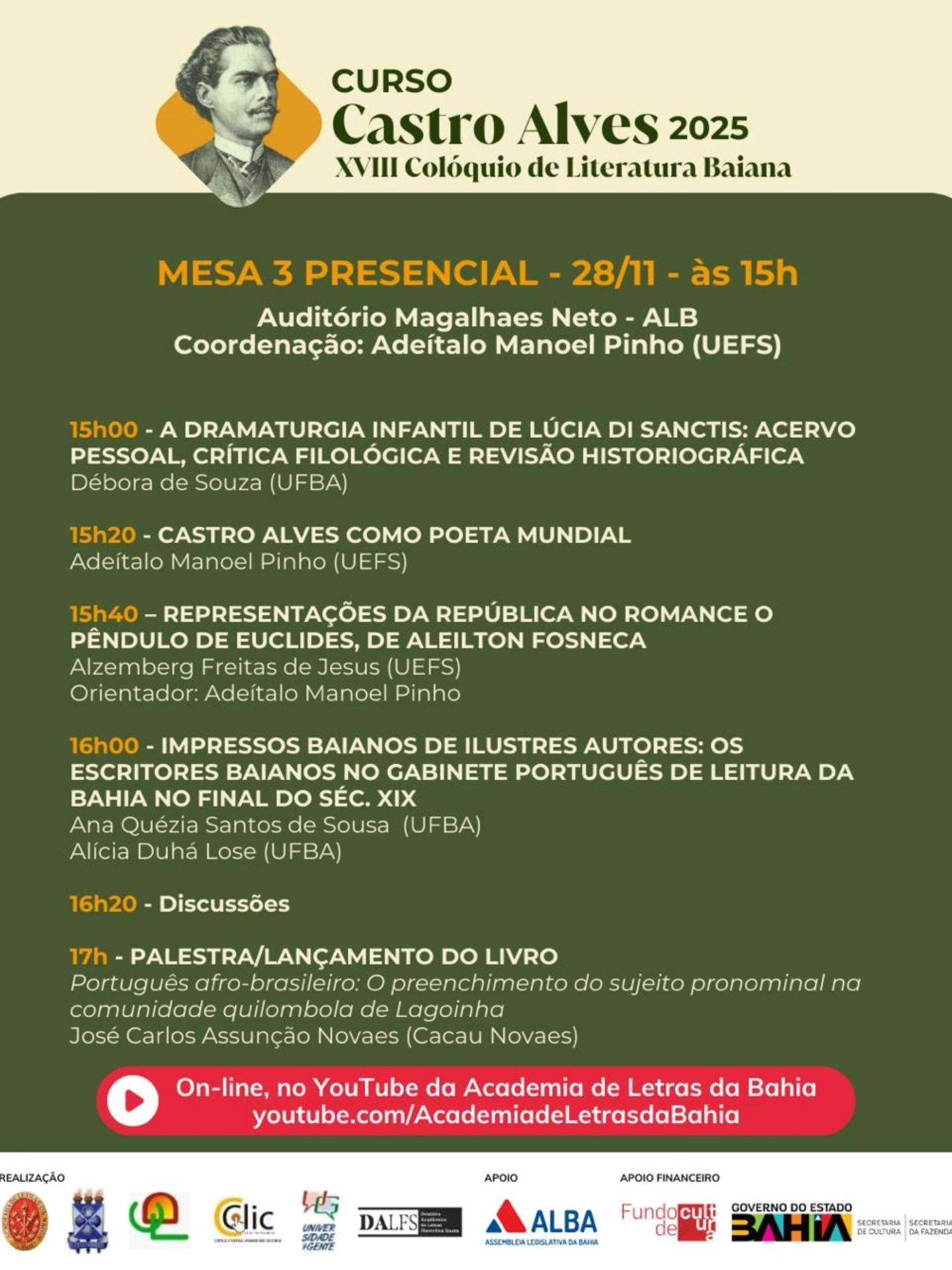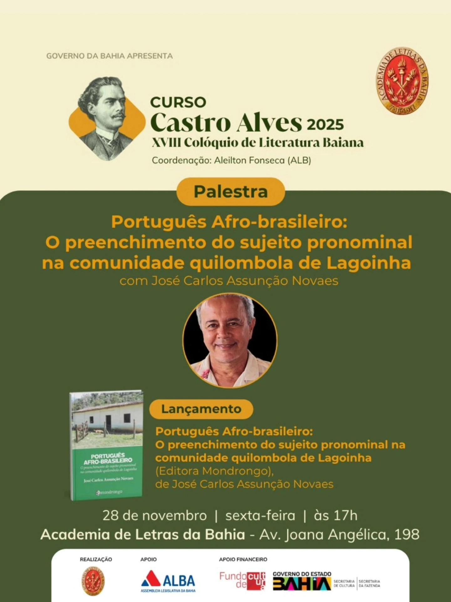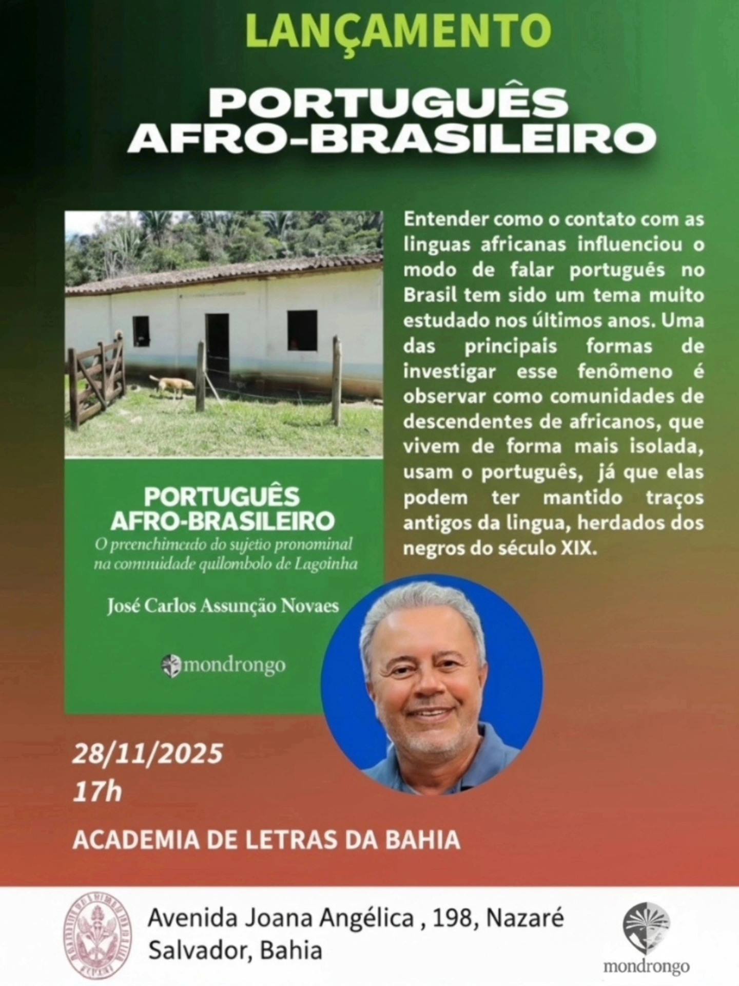O Professor Doutor José Carlos Assunção Novaes lança, dentro das comemorações do novembro negro, o livro “Português Afro-brasileiro: O preenchimento do pronome sujeito na comunidade quilombola de Lagoinha”. O evento acontece no dia 28 deste mês, às 17h, na Academia de Letras da Bahia, faz parte da programação do Curso Castro Alves promovido pela instituição. Durante o lançamento, o professor fará uma palestra sobre o tema e, logo a seguir, participará de uma sessão de autógrafos, momento em que receberá os convidados e amigos.